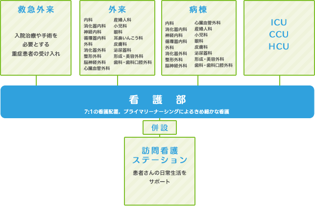 チーム医療を核としたプライマリーナーシングが、千葉メディカルセンターが提供する看護の最大の特徴です。二次救急医療に対応しているほか、リハビリテーション部や訪問看護ステーションを有しているので、救急患者さんの受け入れから治療、機能回復、日常生活に復帰以降のサポートなど、一貫して看ることができます。各病棟では、看護師が責任をもって患者さんを受け持ち、やさしくあたたかな看護を実践しています。